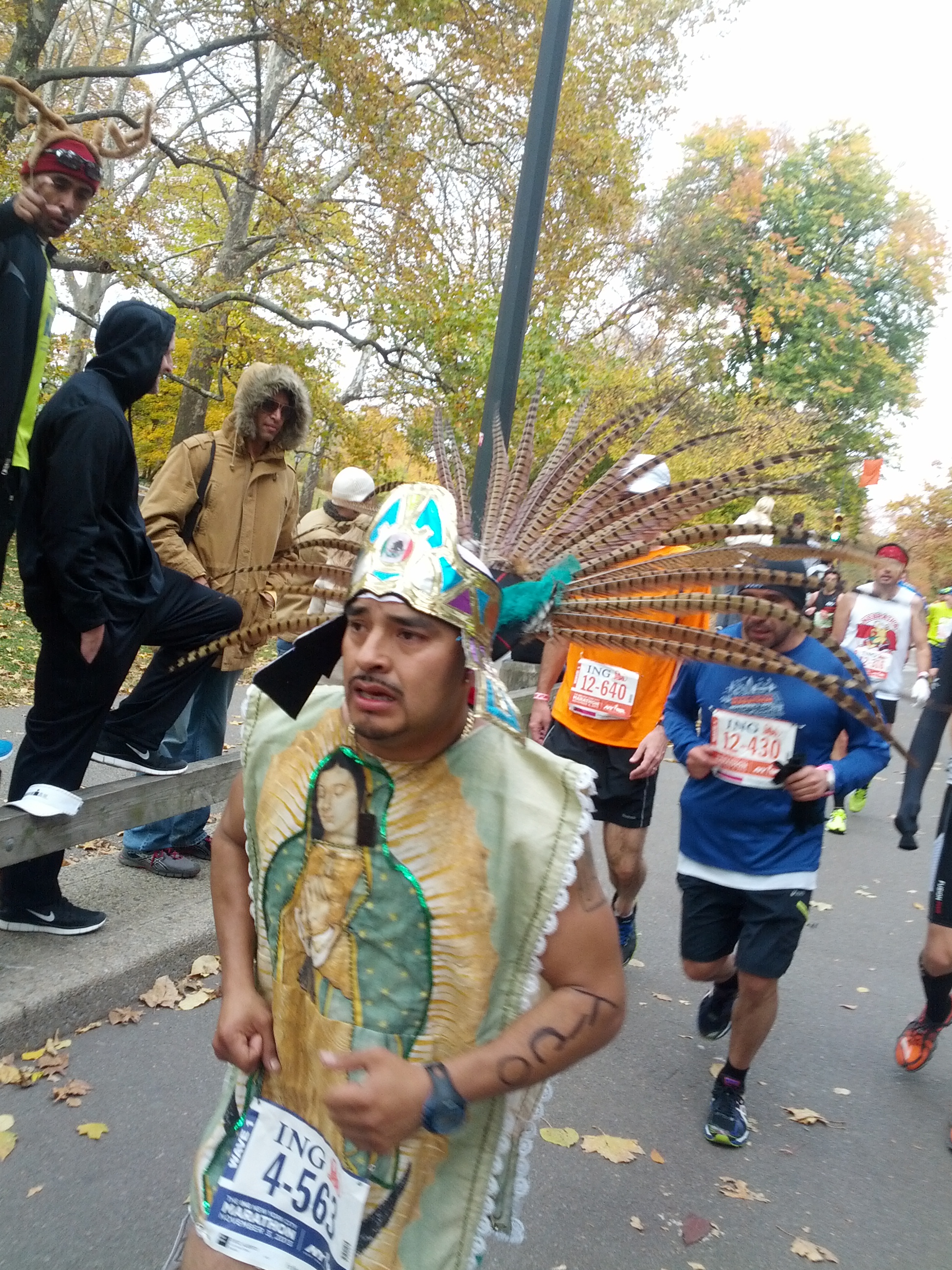 De laatste kilometers gaan moeizaam door het zware parcours maar het einde is in zicht als je in Central Park komt. Daar haal ik ook nog een mooie indiaan in met een prachtige tooi, volgens mij was het ook nog echt een hele authentieke.
