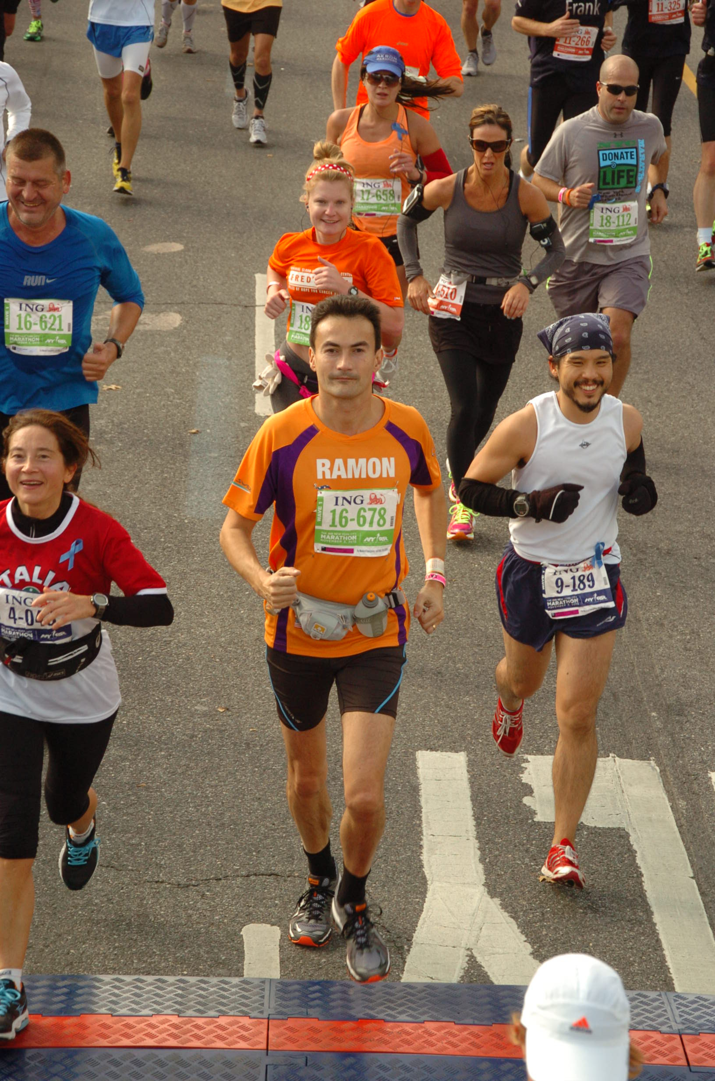 Op de hoek van 79th Street en First Avenue is Holland Spot, een verzamelpunt van Nederlandse aanhang waar oranje de allesbepalende kleur is. Hier had ik met Désirée – mijn vrouw – afgesproken. Ik weet een sms-je te sturen op 70th dat ik eraan kom, en dan zijn er eindelijk de oranje ballonnen en de vele Nederlandse supporters, ik zie en kus Désirée na 29 loodzware kilometers, dat is pas een goede opkikker. Met een extra banaan en gel op zak ga ik weer door voor de laatste 13 kilometers rennen!