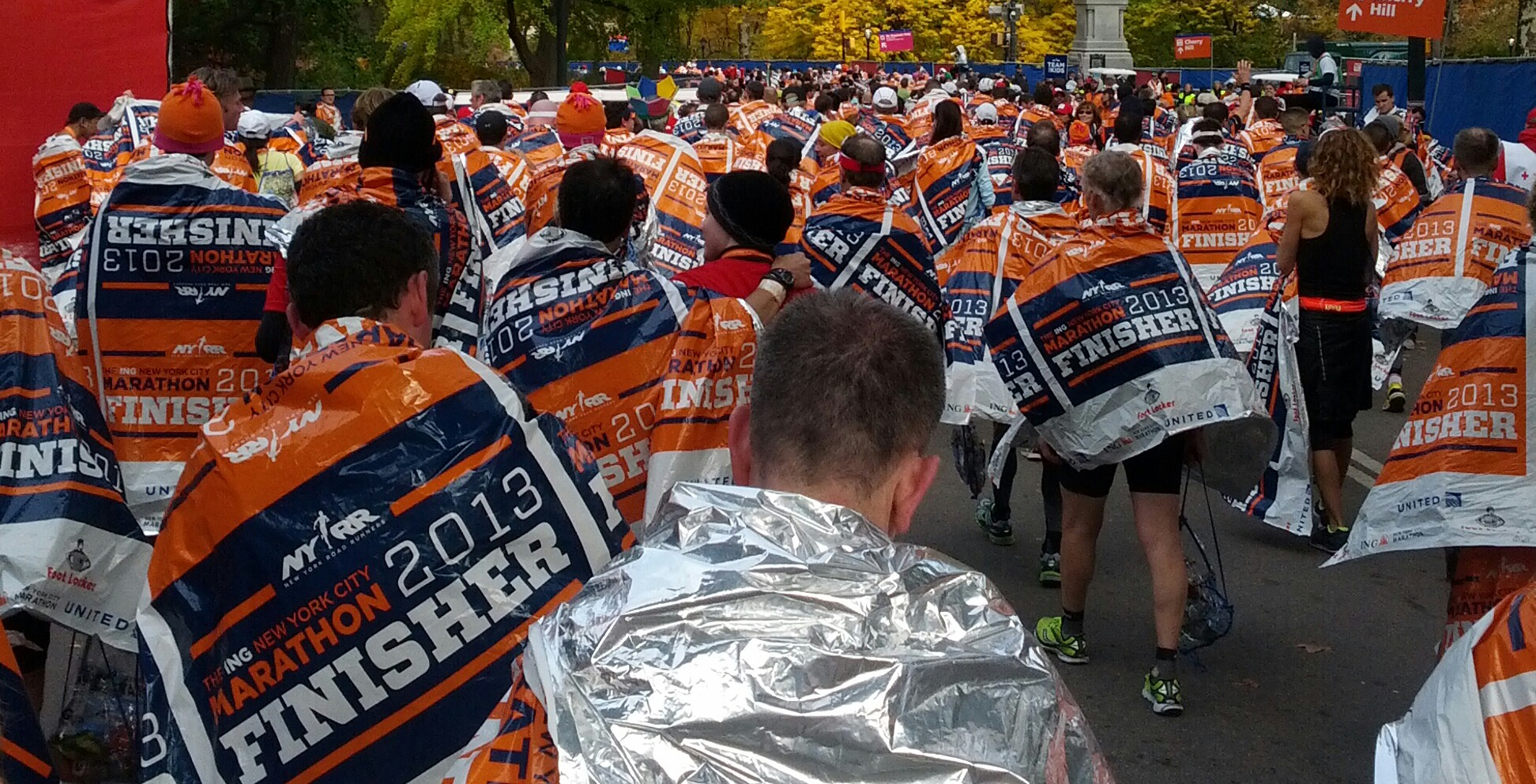 Daarna begint de looptocht naar de uitgang van Central Park. Met het karakteristieke Marathon 2013 Finisher folie om je heen loop je wat verzonken in gedachten met de medelopers door het park. Hier en daar gaat het wat minder goed met lopers maar de meerderheid strompelt rustig en stil voort, een enkeling maakt een foto of belt iemand op.