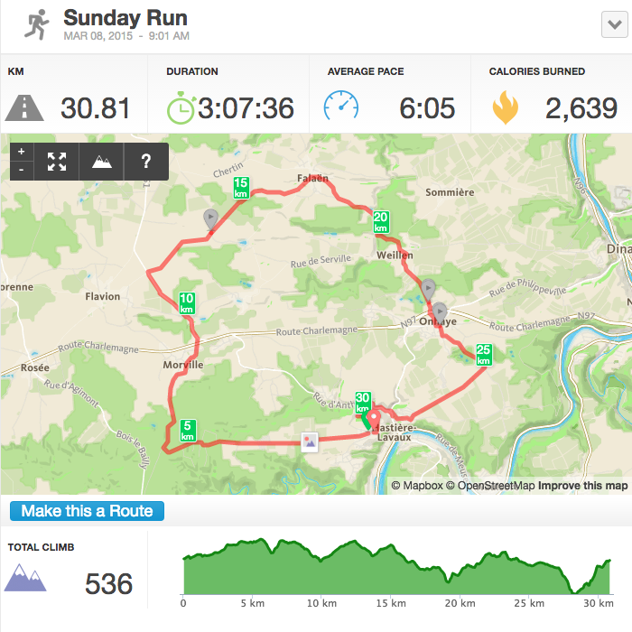 Het mannenweekend viel namelijk midden in een zware trainingsweek voor de London Marathon van 26 april. Op de zondag stond er een 30 kilometer op de planning. De dag na de zaterdag in een mannenweekeinde…. dan weet je dat het zwaar gaat worden. De week vantevoren had ik wel alvast een prachtige route uitgestippeld met Runkeeper. Het liefst loop ik over minder drukke wegen en veel stukken rechtdoor. De heuvels in die omgeving zijn echter niet te vermijden.