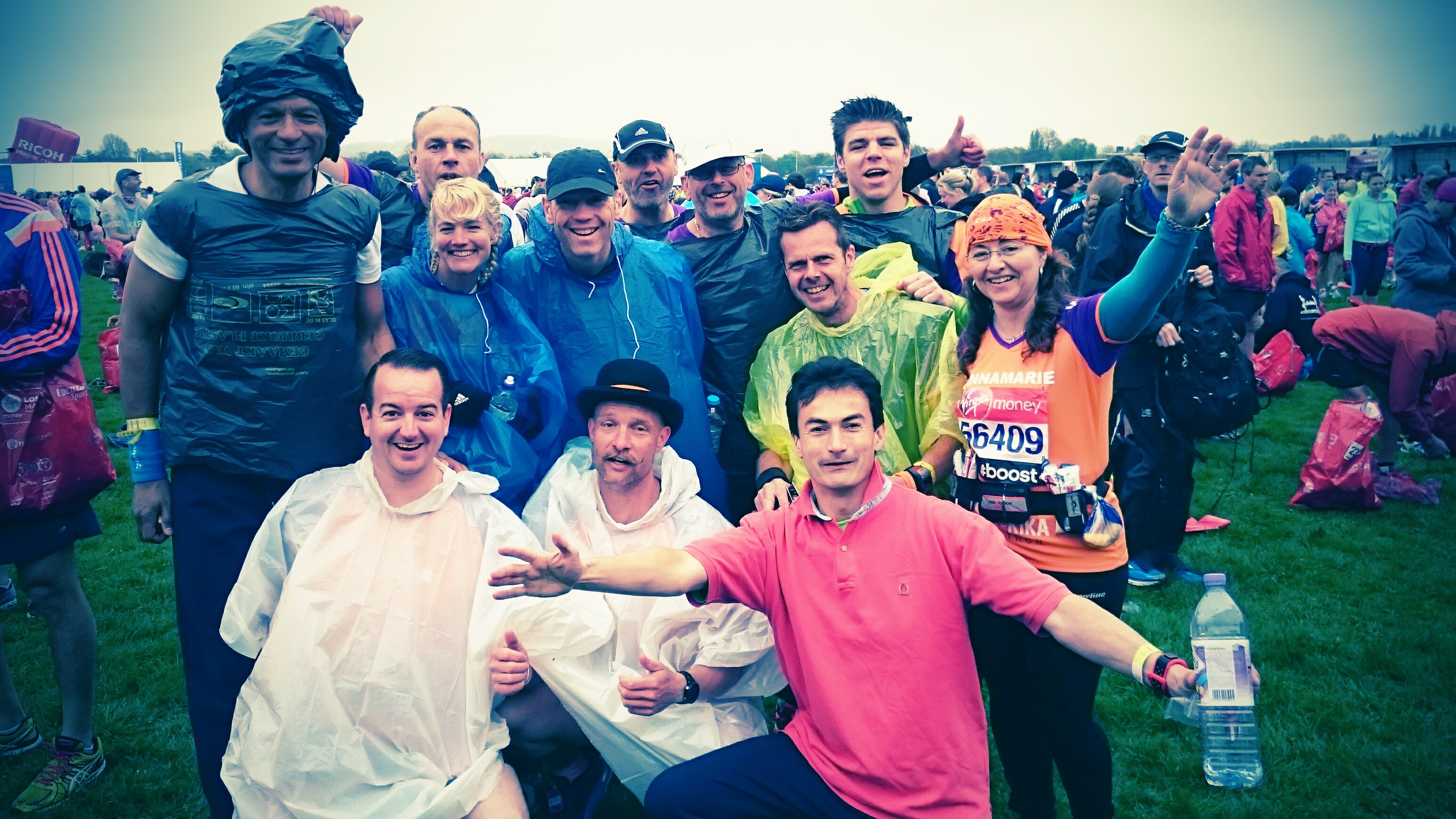 Na aankomst met de trein mag je eerst ruim 2 uur wachten in het startveld op het St James Park, het is koel en het regent heel licht. Je startnummer – die je de dag ervoor hebt opgehaald bij de Expo in ExCel – zit al op je shirt. Het is een kleine groep van 12 KiKa runners en we zitten gezellig bij elkaar. De spanning neemt toe als je je tas met spullen mag afgeven en je voor de laatste keer naar de WC gaat. Dan mag je eindelijk naar je eigen vak – in mijn geval was het voorin: Blue – vak 3. Marathon Tip 2! Lieg tegen de marathon organisatie over je verwachte eindtijd. Geef een eindtijd aan die een half uur sneller is dan je werkelijk gaat/kan lopen. Dit zodat je als een van de snellere starters wordt ingedeeld. Dat kans is groter dat je dan eigen tempo kan lopen, er zijn natuurlijk snellere lopers die om je heen gaan slalommen, maar die lopen zich stuk, zie Tip 4.