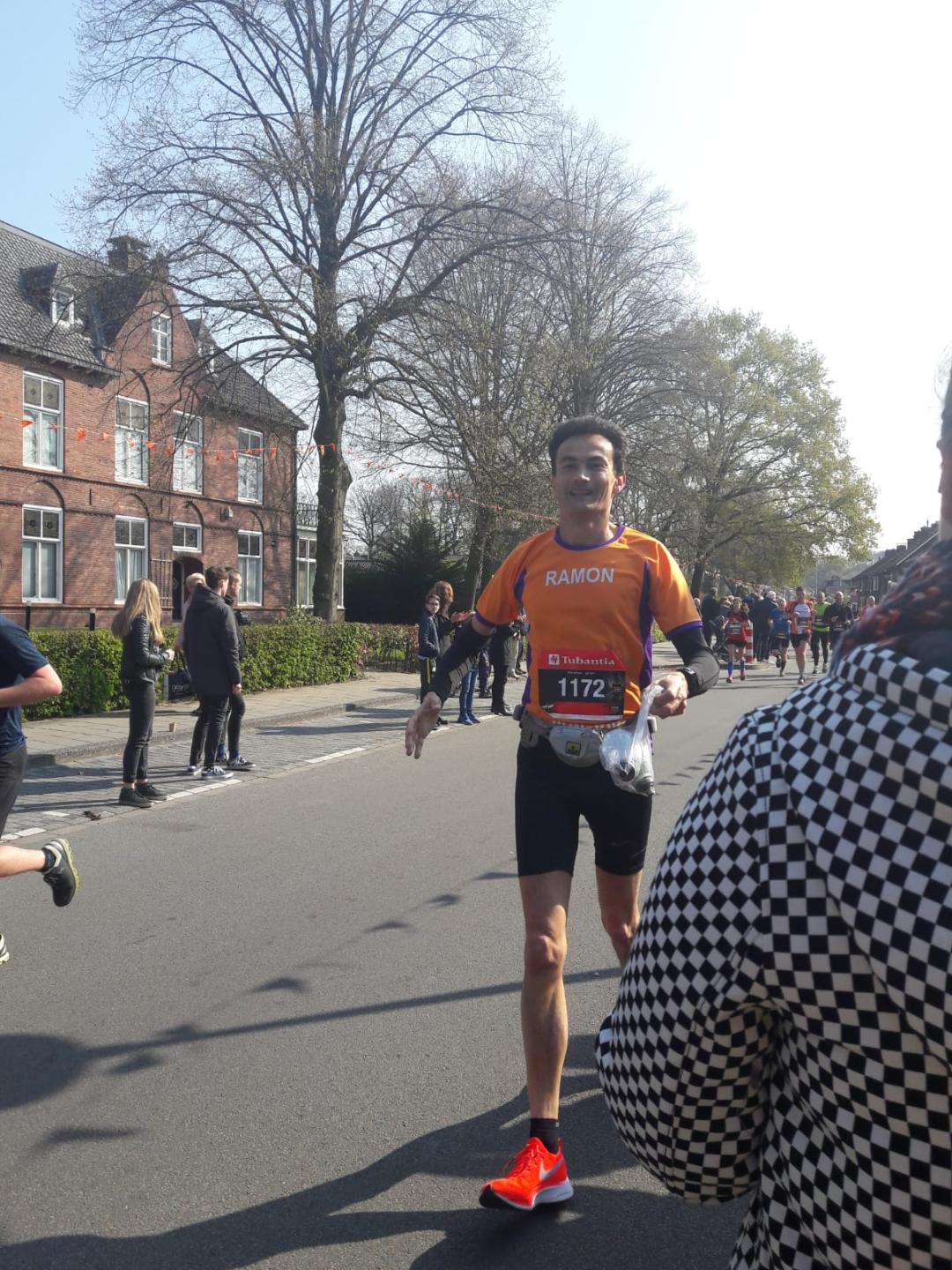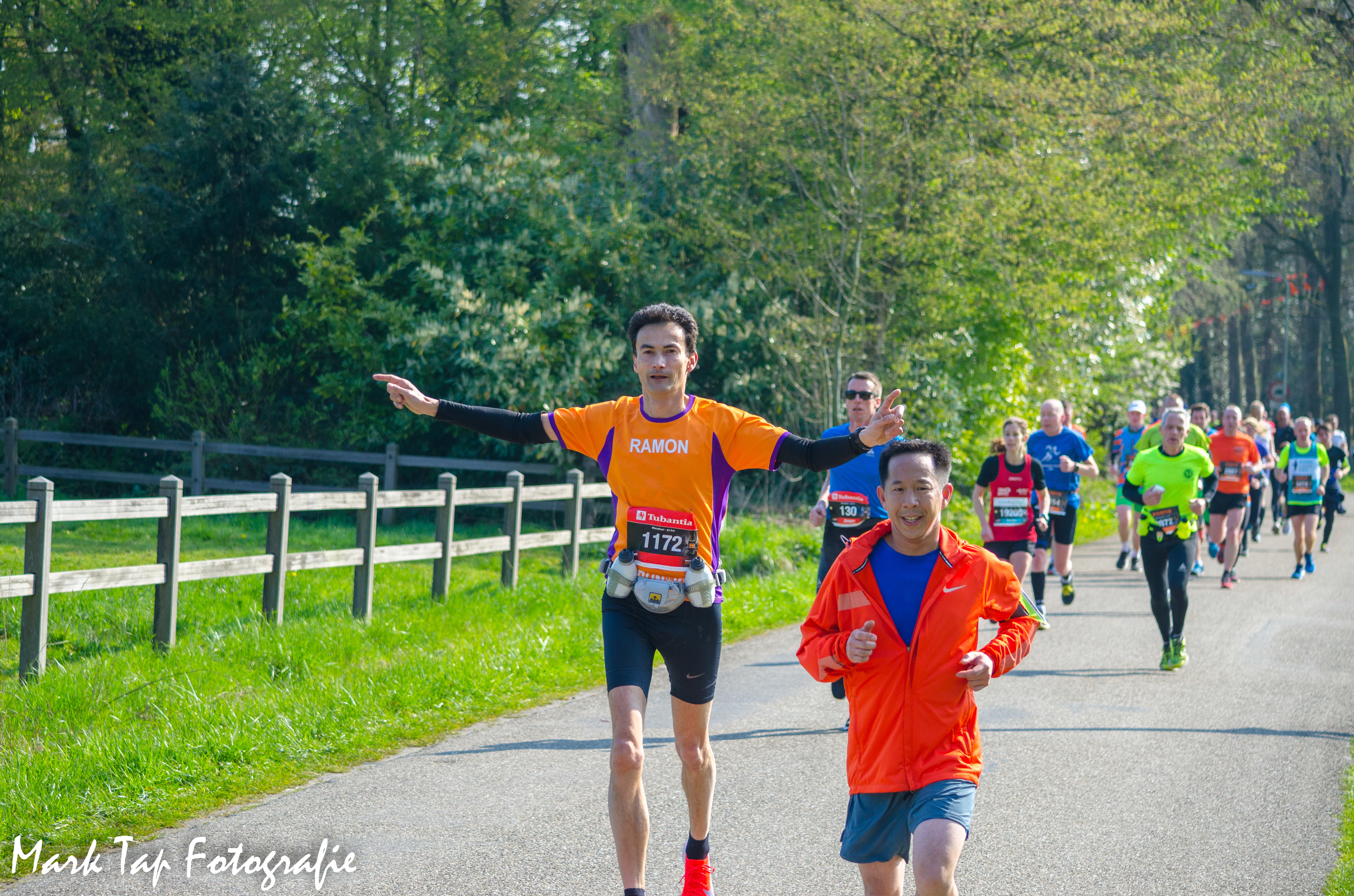 Eerste 10km – 48:30. De eerste 10 km vlogen voorbij. We konden gelukkig goed vooraan starten! Er zijn in Enschede startvakken die op verwachte eindtijd zijn ingedeeld. Dat is bij iedere marathon zo, maar hier mocht je je eigen startvak kiezen, wat een luxe! Het startschot klonk en we konden beginnen. Ik probeerde mijn tempo te vinden – totdat na 400 meter één van mijn drinkbidons uit de gordel viel. Ik draaide me snel om en pakte de bidon snel op. Het is erg wonderbaarlijk dat niemand tegen mij opbotste. Adrealine-gehalte was gelijk lekker hoog 🙂 mijn 1e kilometer was daarom de snelste van deze marathon 🙂