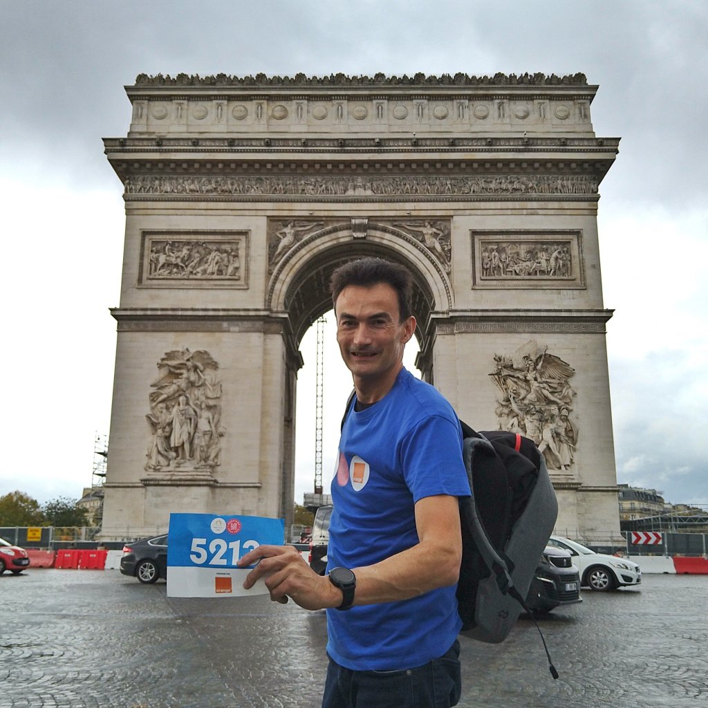 Met de metro ging ik vervolgens naar het station onder de Arc de Triomphe. De organisatie had een plek geregeld waar je je rugtas kon afgeven, ik ging me 2 kilometer warm lopen en was onder de indruk van wat ze hadden opgebouwd. Een prachtige start en finish plek!